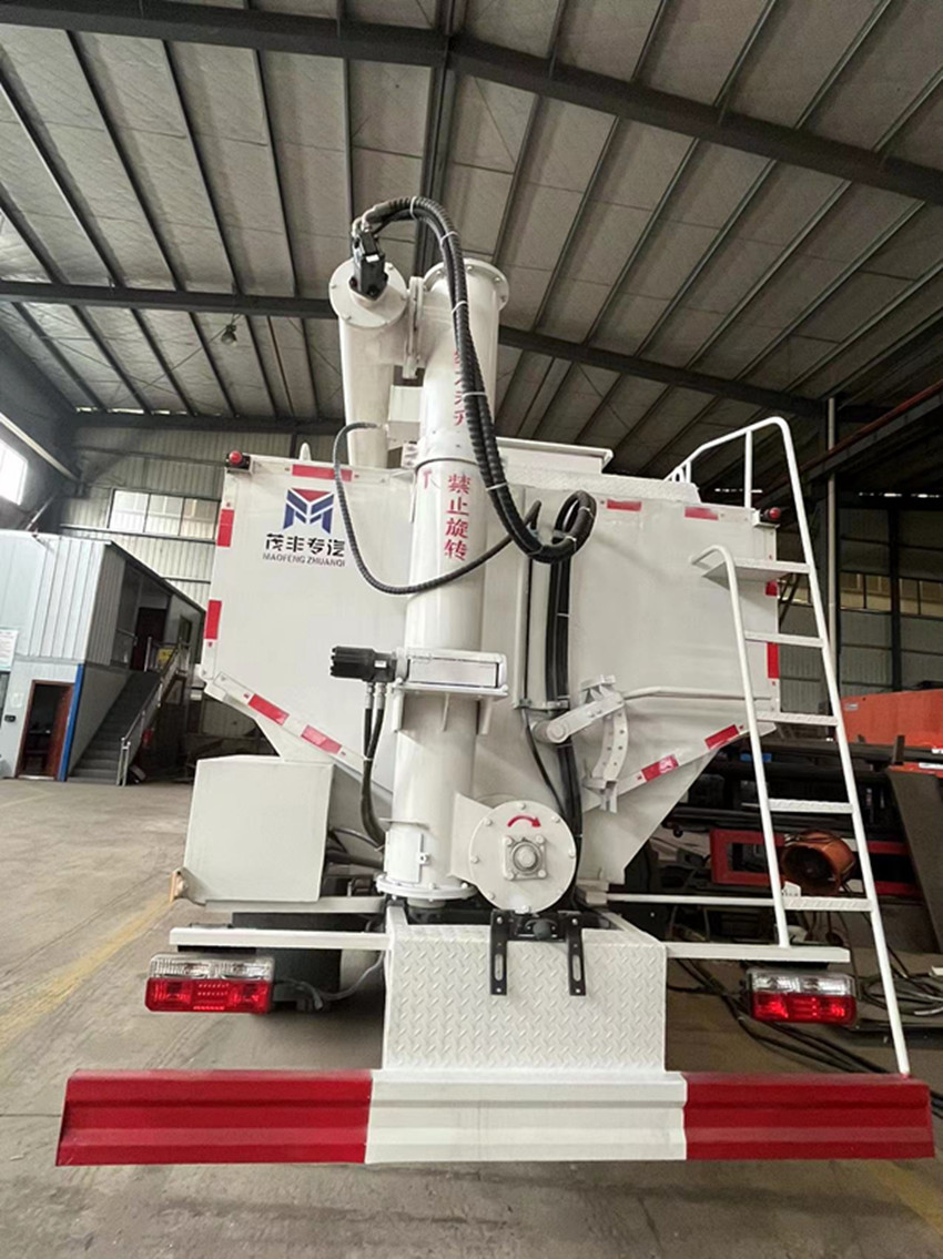 散裝飼料運(yùn)輸車,散裝飼料車的飼料罐架設(shè)在卡車的底盤上,罐頂開有進(jìn)料口.頂部的一根螺旋輸送卸料管(俗稱卸料絞龍)則可自由回轉(zhuǎn)和抬升,抬升的仰角可達(dá)60度。運(yùn)輸時(shí),頂部的螺旋管平臥在罐頂;卸料時(shí)則抬起,使管端的出料口與畜禽飼養(yǎng)場(chǎng)貯料罐頂部的進(jìn)料門相接,駕駛室內(nèi)裝有操縱裝置(操縱裝置也可裝置在罐體尾部),卸料時(shí)通過車底的動(dòng)力輸出軸和減速器來驅(qū)動(dòng)螺旋,以完成卸料。