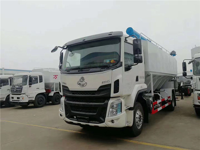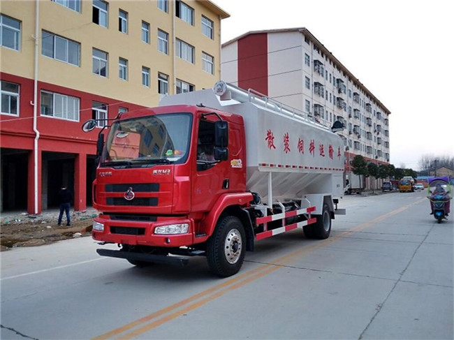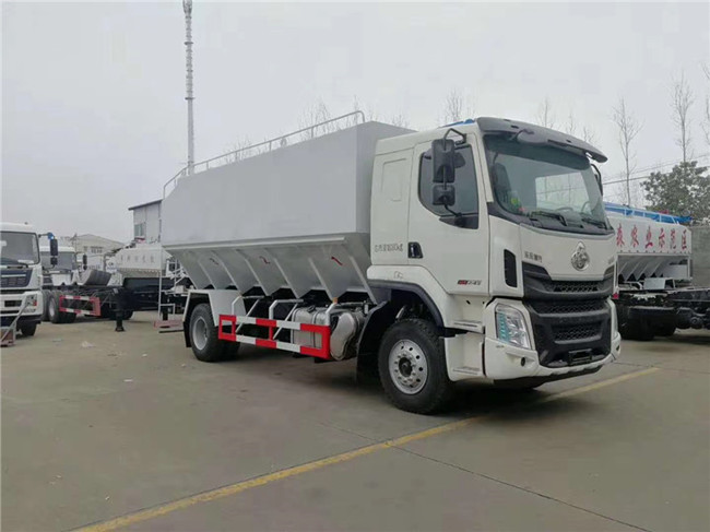 散裝飼料運(yùn)輸車,散裝飼料車的飼料罐架設(shè)在卡車的底盤上,罐頂開有進(jìn)料口.頂部的一根螺旋輸送卸料管(俗稱卸料絞龍)則可自由回轉(zhuǎn)和抬升,抬升的仰角可達(dá)60度。運(yùn)輸時,頂部的螺旋管平臥在罐頂;卸料時則抬起,使管端的出料口與畜禽飼養(yǎng)場貯料罐頂部的進(jìn)料門相接,駕駛室內(nèi)裝有操縱裝置(操縱裝置也可裝置在罐體尾部),卸料時通過車底的動力輸出軸和減速器來驅(qū)動螺旋,以完成卸料。