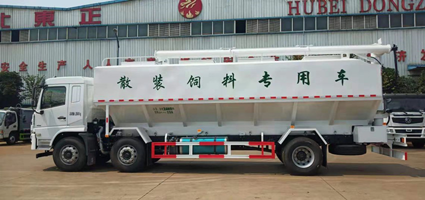 散裝飼料運(yùn)輸車,散裝飼料車的飼料罐架設(shè)在卡車的底盤上,罐頂開有進(jìn)料口.頂部的一根螺旋輸送卸料管(俗稱卸料絞龍)則可自由回轉(zhuǎn)和抬升,抬升的仰角可達(dá)60度。運(yùn)輸時(shí),頂部的螺旋管平臥在罐頂;卸料時(shí)則抬起,使管端的出料口與畜禽飼養(yǎng)場貯料罐頂部的進(jìn)料門相接,駕駛室內(nèi)裝有操縱裝置(操縱裝置也可裝置在罐體尾部),卸料時(shí)通過車底的動(dòng)力輸出軸和減速器來驅(qū)動(dòng)螺旋,以完成卸料。