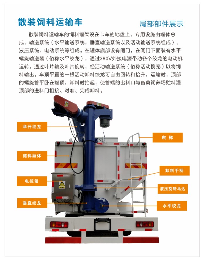 散裝飼料運輸車,散裝飼料車的飼料罐架設(shè)在卡車的底盤上,罐頂開有進料口.頂部的一根螺旋輸送卸料管(俗稱卸料絞龍)則可自由回轉(zhuǎn)和抬升,抬升的仰角可達60度。運輸時,頂部的螺旋管平臥在罐頂;卸料時則抬起,使管端的出料口與畜禽飼養(yǎng)場貯料罐頂部的進料門相接,駕駛室內(nèi)裝有操縱裝置(操縱裝置也可裝置在罐體尾部),卸料時通過車底的動力輸出軸和減速器來驅(qū)動螺旋,以完成卸料。