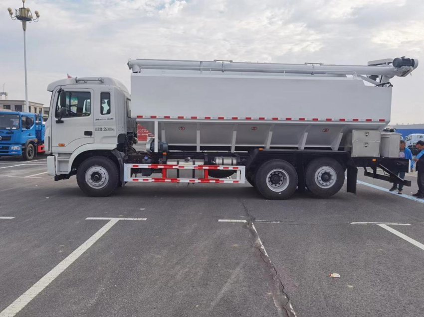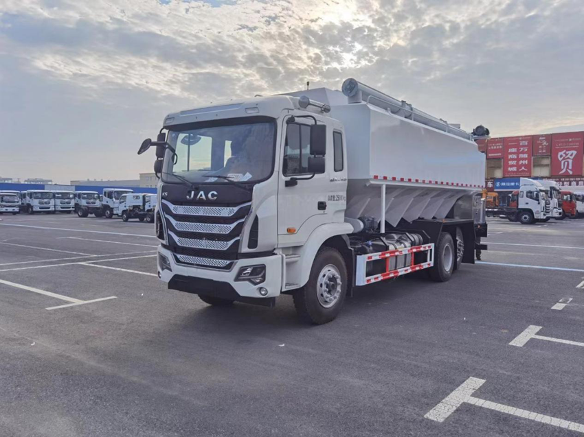 散裝飼料運(yùn)輸車,散裝飼料車的飼料罐架設(shè)在卡車的底盤上,罐頂開有進(jìn)料口.頂部的一根螺旋輸送卸料管(俗稱卸料絞龍)則可自由回轉(zhuǎn)和抬升,抬升的仰角可達(dá)60度。運(yùn)輸時(shí),頂部的螺旋管平臥在罐頂;卸料時(shí)則抬起,使管端的出料口與畜禽飼養(yǎng)場(chǎng)貯料罐頂部的進(jìn)料門相接,駕駛室內(nèi)裝有操縱裝置(操縱裝置也可裝置在罐體尾部),卸料時(shí)通過(guò)車底的動(dòng)力輸出軸和減速器來(lái)驅(qū)動(dòng)螺旋,以完成卸料。