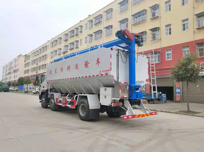 散裝飼料運(yùn)輸車(chē),散裝飼料車(chē)的飼料罐架設(shè)在卡車(chē)的底盤(pán)上,罐頂開(kāi)有進(jìn)料口.頂部的一根螺旋輸送卸料管(俗稱(chēng)卸料絞龍)則可自由回轉(zhuǎn)和抬升,抬升的仰角可達(dá)60度。運(yùn)輸時(shí),頂部的螺旋管平臥在罐頂;卸料時(shí)則抬起,使管端的出料口與畜禽飼養(yǎng)場(chǎng)貯料罐頂部的進(jìn)料門(mén)相接,駕駛室內(nèi)裝有操縱裝置(操縱裝置也可裝置在罐體尾部),卸料時(shí)通過(guò)車(chē)底的動(dòng)力輸出軸和減速器來(lái)驅(qū)動(dòng)螺旋,以完成卸料。