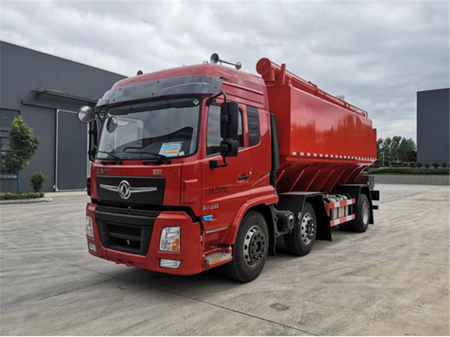 散裝飼料運(yùn)輸車,散裝飼料車的飼料罐架設(shè)在卡車的底盤上,罐頂開有進(jìn)料口.頂部的一根螺旋輸送卸料管(俗稱卸料絞龍)則可自由回轉(zhuǎn)和抬升,抬升的仰角可達(dá)60度。運(yùn)輸時(shí),頂部的螺旋管平臥在罐頂;卸料時(shí)則抬起,使管端的出料口與畜禽飼養(yǎng)場(chǎng)貯料罐頂部的進(jìn)料門相接,駕駛室內(nèi)裝有操縱裝置(操縱裝置也可裝置在罐體尾部),卸料時(shí)通過車底的動(dòng)力輸出軸和減速器來驅(qū)動(dòng)螺旋,以完成卸料。