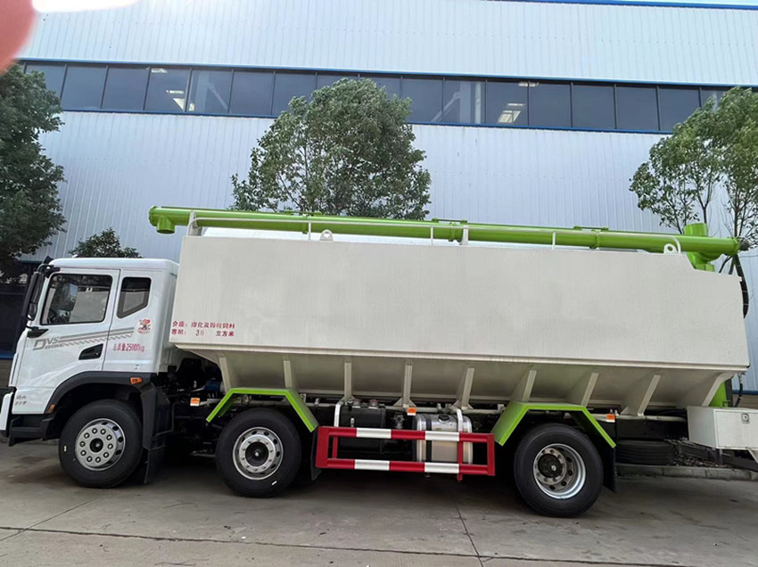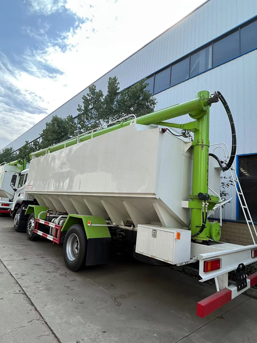 散裝飼料運輸車,散裝飼料車的飼料罐架設(shè)在卡車的底盤上,罐頂開有進(jìn)料口.頂部的一根螺旋輸送卸料管(俗稱卸料絞龍)則可自由回轉(zhuǎn)和抬升,抬升的仰角可達(dá)60度。運輸時,頂部的螺旋管平臥在罐頂;卸料時則抬起,使管端的出料口與畜禽飼養(yǎng)場貯料罐頂部的進(jìn)料門相接,駕駛室內(nèi)裝有操縱裝置(操縱裝置也可裝置在罐體尾部),卸料時通過車底的動力輸出軸和減速器來驅(qū)動螺旋,以完成卸料。