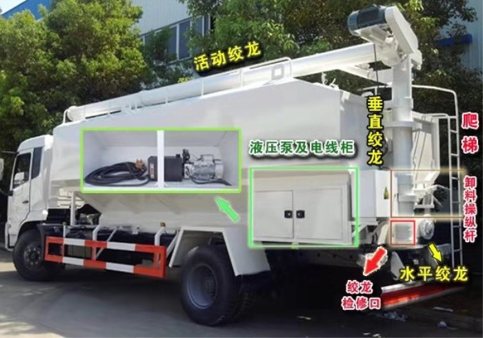 上裝配置:罐體采用4mm優(yōu)質(zhì)鈦鋼板制作,罐體分為肆個倉(可根據(jù)用戶需求做多個分倉),可以各分倉卸料順序和速度,整車3條絞龍(底部水平絞龍、尾部垂直絞龍、頂部舉升絞龍),由3個5.5kw 380v電機(jī)帶動各絞龍工作,頂部絞龍液壓舉升,可左右旋轉(zhuǎn)180°