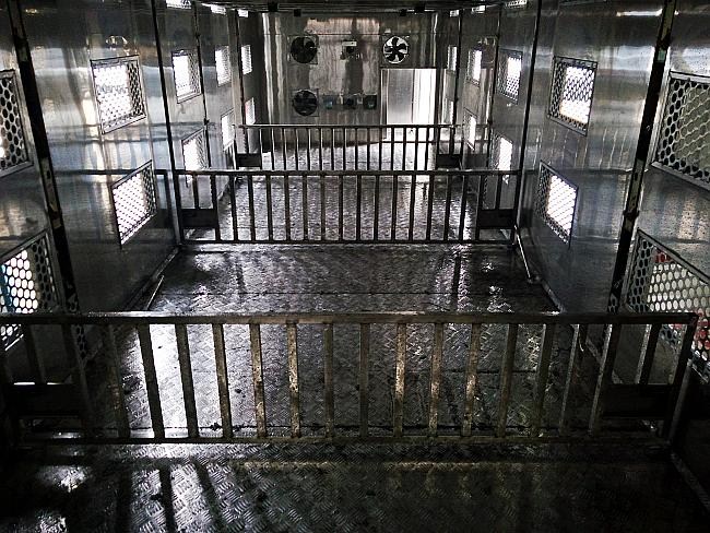 5.進出通道:后門通過液壓系統(tǒng)自動展開形成仔豬進出箱體的通道,設(shè)有護欄,方便仔豬上下.