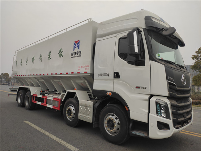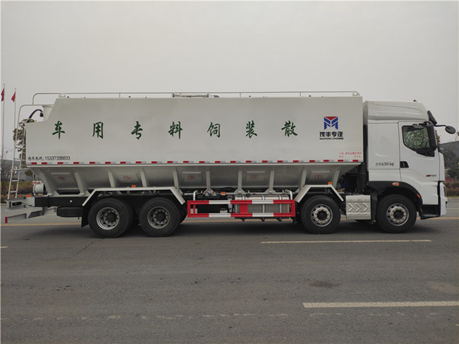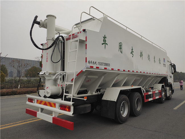 散裝飼料運輸車,散裝飼料車的飼料罐架設在卡車的底盤上,罐頂開有進料口.頂部的一根螺旋輸送卸料管(俗稱卸料絞龍)則可自由回轉和抬升,抬升的仰角可達60度。運輸時,頂部的螺旋管平臥在罐頂;卸料時則抬起,使管端的出料口與畜禽飼養(yǎng)場貯料罐頂部的進料門相接,駕駛室內裝有操縱裝置(操縱裝置也可裝置在罐體尾部),卸料時通過車底的動力輸出軸和減速器來驅動螺旋,以完成卸料。