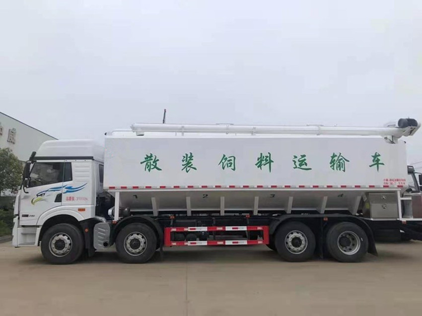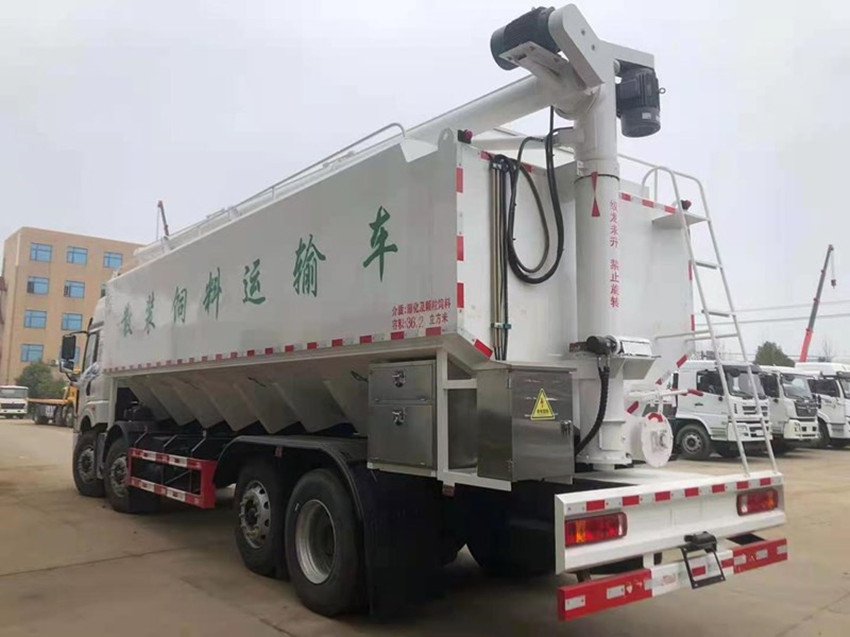 散裝飼料運輸車,散裝飼料車的飼料罐架設在卡車的底盤上,罐頂開有進料口.頂部的一根螺旋輸送卸料管(俗稱卸料絞龍)則可自由回轉(zhuǎn)和抬升,抬升的仰角可達60度。運輸時,頂部的螺旋管平臥在罐頂;卸料時則抬起,使管端的出料口與畜禽飼養(yǎng)場貯料罐頂部的進料門相接,駕駛室內(nèi)裝有操縱裝置(操縱裝置也可裝置在罐體尾部),卸料時通過車底的動力輸出軸和減速器來驅(qū)動螺旋,以完成卸料。